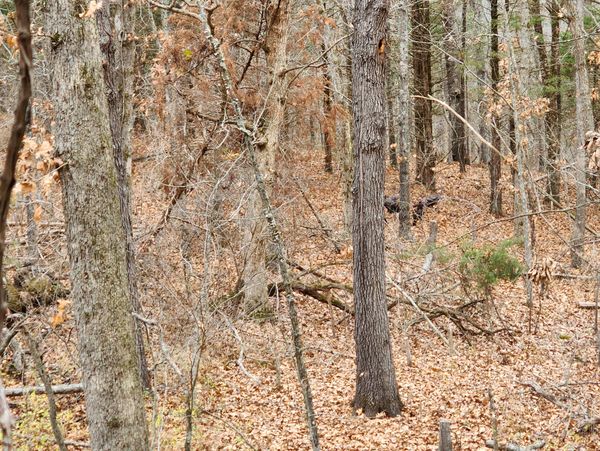 By far my favorite places on Rosewood are the many acres of woods. I personally cut and maintain almost a mile and a half of trails and walk them alone and with the dogs frequently. They are crisscrossed with miles of valleys, creeks and streams, and dotted with deep pools which hold water for most of the year. This is where I recharge my batteries, commune with The Creator and all of Her magnificent creatures, and where my heart usually is no matter where I am or what I'm doing. Without these woods, I would be lost! If you look closely, you can see a flock of turkeys just right of center.