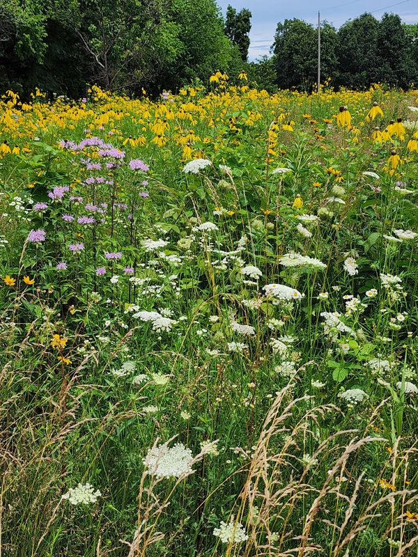 I have catalogued and photographed over 100 different species of native grasses, clovers, flowers and plants in the field alone. This photo is after only 4 years. The field changes from an early Spring look to a summer look, early fall look and then the late fall look with different plants and flowers growing, blooming and seeding throughout the year.